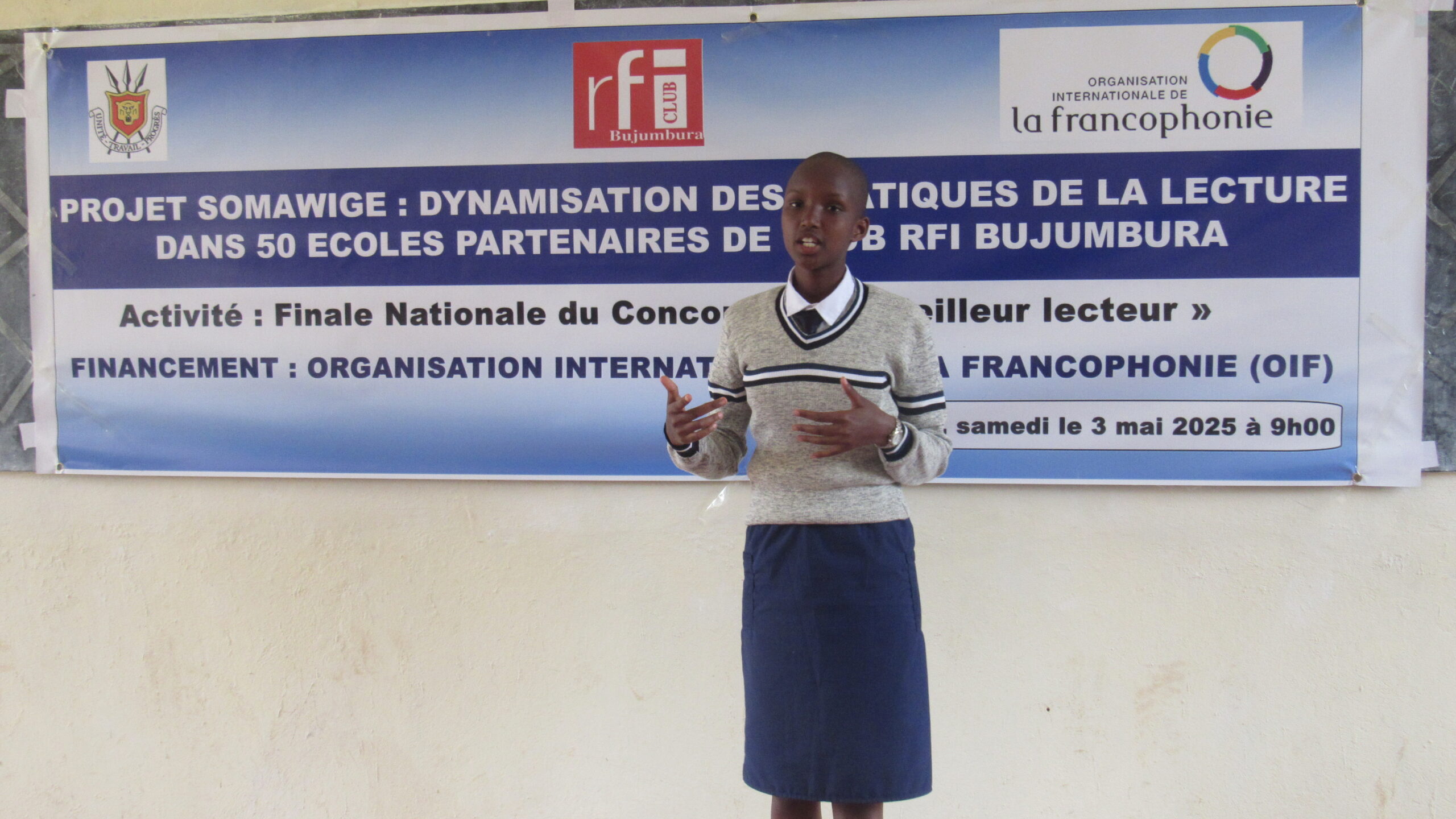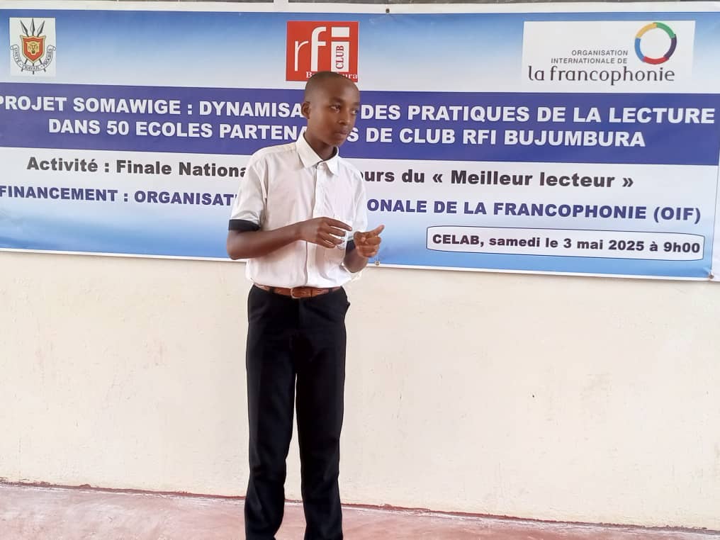 Dans le cadre du projet « SOMAWIGE » qui vise à redynamiser les pratiques de la lecture dans les écoles, Club RFI Bujumbura a organisé la phase finale nationale du concours de « meilleur lecteur ». Cet événement s’est déroulé au CELAB de l’université du Burundi ce samedi 03 Mai 2025. Cette finale coïncide avec la fin des activités du SOMAWIGE (Lire pour apprendre), projet appuyé par l’Organisation Internationale de la Francophonie, qui avaient démarré en septembre 2024.